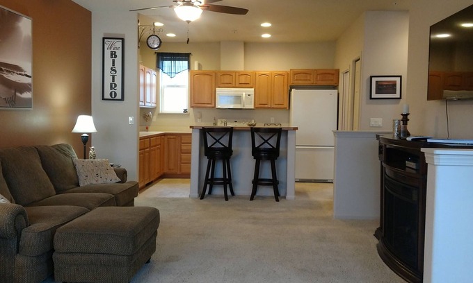 This relaxing getaway is newly built, 1100 sq ft, has 2 bedrooms and 1.5 bathrooms. It is our tastefully furnished home away from home. 1 King, 1 Queen bed, both with comfy pillow top mattresses. Enjoy the peek a boo river views from your own private patios off of the living room and master bedroom or snuggle up for a movie in front of the living rooms cozy electric fireplace. Great restaurants, wine bars, coffee bistros, salons, galleries and shops only steps away. The unit includes linens, TVs in each room, DVD players, towels, hair dryer, games, puzzles, washer, dryer and it has a fully equipped kitchen. Covered parking right next to the front door.