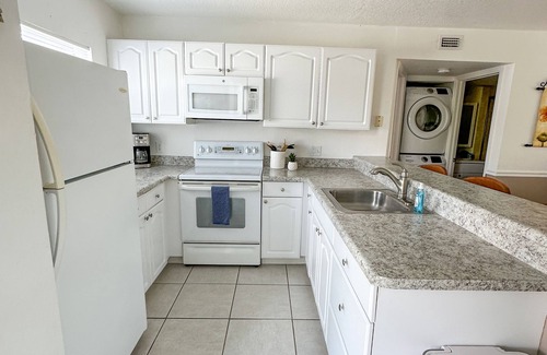 Your home away from home in Punta Gorda with 2 bedrooms on the first level! This terrific condo features Queen bed in the master bedroom with walk in closet and en quite with tub/shower combo. Guest bedroom has 2 twin beds and is right next to guest bathroom with a shower. Full size washer and dryer in unit. Enjoy fully stocked kitchen for home cooked meals and beautiful water view from screened in covered lanai just outside of the living room. One assigned parking space right in front of the unit and extra spaces always available in guest parking.