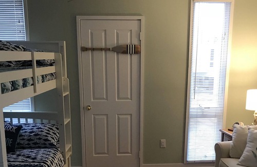 This beautiful and spacious condo is located on Montauk Downs Golf Course and is a 5-minute bike ride to both Ditch Plains and to town. Private carport area includes 5 surf board racks for easy loading. The condo is multi-level. It has two master bedrooms, both with a queen-sized bed, a balcony, a walk-in closet and their own bathrooms right outside of their doors. The third "kids" bedroom has a full over full bunk with a twin trundle, a pull-out couch and a gaming TV. On the first floor is a living room with a fireplace, a kitchen, dining room and a charming patio with a Weber grill. This is the perfect place for your family vacation or your escape from the city!