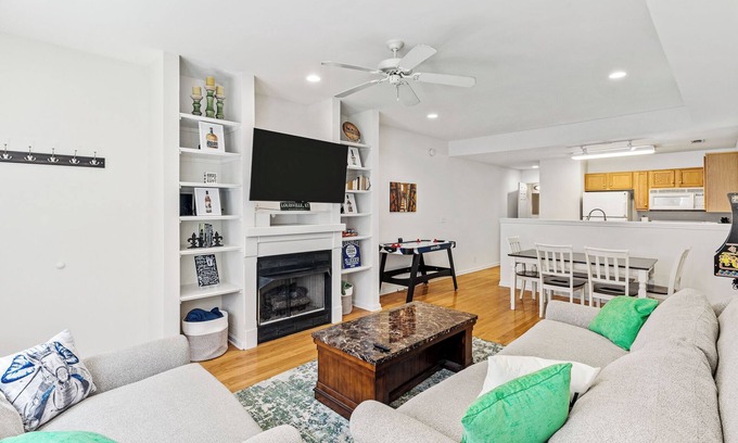 This condo has three floors which is creates a lot of privacy. When you enter the condo on the first floor you walk into the living room/kitchen area. Here you will find air hockey and a Ms. Pac-man arcade game. Also on the first floor is a half bath. The second floor contains 1 bedroom with a king size bed and a full bathroom attached. The second floor also contains the laundry room. On the third floor you will find a bedroom with a queen bed and a full size daybed with a twin trundle and private bathroom. There is a doorbell camera that records audio and video when it is triggered by motion. This will be on during your stay.