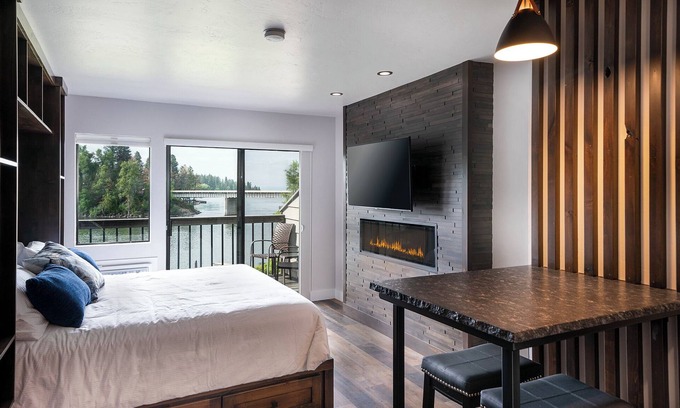 As you enter the condo, you are greeted by the bathroom with a double vanity and standing shower on the right and the spacious open-concept living area straight ahead. The living area consists of a kitchenette that has everything you need to make a simple meal with a double burner stovetop, a high-top table, a cozy chair, a king-sized bed, a flat screen tv, and a fireplace to cozy up to. As you move through the living area, you will come to the balcony that is private to this unit with patio seating with water views! The balcony has absolutely stunning views and is perfect to have your morning coffee and enjoy the sunrise.