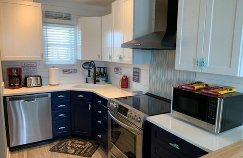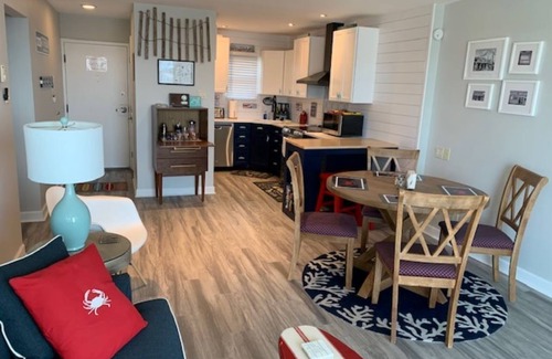 You will never tire of the beautiful ocean view from the roomy 4th floor balcony in this oceanfront building! This lovely home away from home has vinyl flooring throughout (no musty beach smell here!), a newly renovated kitchen with new appliances that opens up into the dining and living space. The kitchen is fully equipped with everything you need to serve up your own meals on those days and nights when you choose to not take advantage of the many Rehoboth eateries that are a short walk away. The dining table comfortably seats 4 plus there are 2 stools at the kitchen peninsula if you have a party of 6. There is plenty of room to spread out in the living room when you feel like watching something on the 58" TV after a glorious day on the beach. But before you do, be sure to enjoy a cool beverage on the balcony while the sun sets and you take in the incredible ocean view. Accommodations include a primary bedroom with King bed and Smart TV, a guest bedroom with 2 twin beds, a Queen sleeper sofa, and a 4-piece bathroom conveniently located between the bedrooms that includes a hair dryer. There is onsite coin laundry and hand soap, dish soap, dish scrubbing pad, dish detergent, trash bags, and kleenex are provided for your convenience. A roll each of paper towels and TP are also provided so you don't have to run to the store right away. A small collection of books, games and puzzles are also provided for your enjoyment. **Please note that you must bring your own bed and bath linens.**