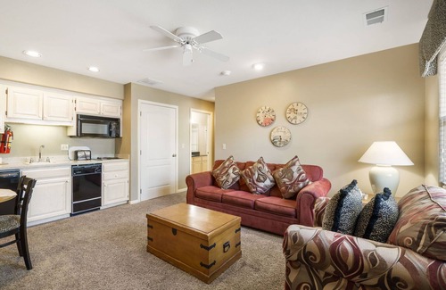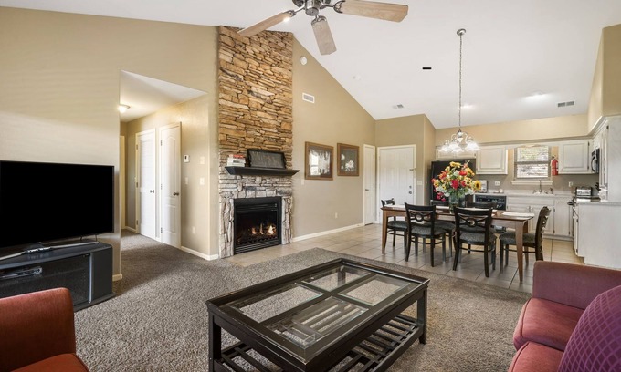 The one-bedroom condo features a king-size bed, jetted tub, fireplace, full kitchen, and dining area. It provides a lovely and comfortable stay for Branson travelers seeking a quieter area to rest from the hustle and bustle of Downtown. The spacious living area is perfect for lounging and relaxing, while the full kitchen is equipped with everything you need to prepare meals during your stay.
