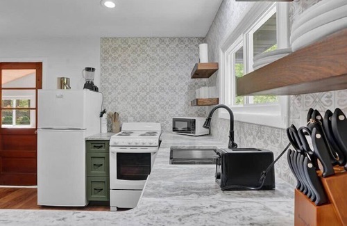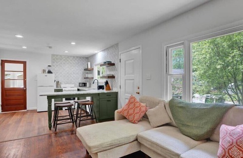 Walk into a beautiful, open coffee and lounge area, ideal for having a morning cup of coffee or an evening cocktail. Then you'll see an open modern kitchen with an oven, dishwasher, and all the tools to make a delicious meal! Walk into the cozy living room with original hardwood floors, a decorative stove, and a brand new smart TV. There are two comfy bedrooms with a queen and full bed, and big fans above them for those warm summer nights. The updated bathroom has a full tub.