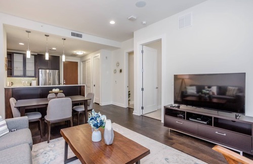 Upon entering, you’ll be met by an open concept living, dining and Kitchen Experience. The kitchen is fully equipped with all high end Kitchen Aide appliances and a built in wine fridge. The kitchen comes fully stocked with all your dining and cooking equipment, along with a coffee maker and tea kettle. The home has high 12' ceilings and coffered ceilings in the living room. The living room has a flat-screen TV and a dining table with bar stools to allow extra seating at the breakfast bar. There is a full size washer and dryer in the home, located in a closet near the living area. The bedroom has a queen-size bed, a flat-screen TV, and an en suite bathroom with a separate entry door from the Kitchen.
