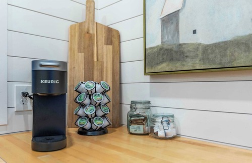 Inside you'll find all the modern amenities for your trip to Waco-- a smart TV with seating space, a plush Queen-sized bed, a functional kitchenette with coffee, and a full-sized bathroom with custom tiled shower. Fun fact: 100+ year-old reclaimed barn wood was used for trim to bring in some old-world character.