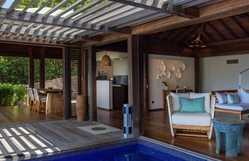 Thevillais composed of two beautiful, air-conditioned bedrooms with a breathtaking view over the oceanand the tropical gardens. Both rooms are furnished with king size, teak canopy beds, storage spaces, and en-suite bathrooms. The master bedroom is located on the main level, while the second suite is on the lower level and opens onto a private terrace with lounge chairs.