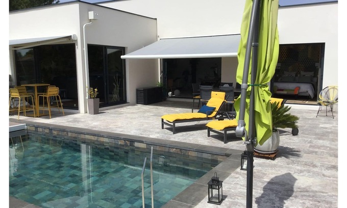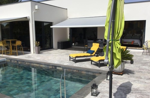 Contemporary 5* comfortable villa near Monbazillac and Bergerac is located in Saint-Nexans. Contemporary 5* comfortable villa near Monbazillac and Bergerac provides accommodation, featuring Private Pool, Bedding/Linens, Internet, among other amenities. This House features Private Pool, Bedding/Linens, Internet, to make your stay a comfortable one.
