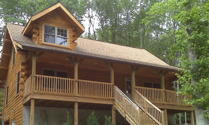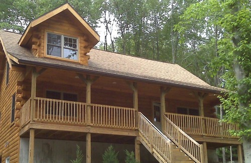 Relax in this beautifully decorated, newly built, contemporary log cabin situated a block from Lake Wallenpaupack and Deer Lake. This year round log home is located in Wallenpaupack Lake Estates, a lake community with many extra amenities such as an indoor heated pool with sauna, two outdoor pools with grill/picnic areas, a snack bar, sand beach on Deer Lake, private 'community only' boat launch and swim docks on Lake Wallenpaupack, tennis courts, beach volleyball, baseball field, basketball, kid's lodge with games/play ground, and skateboarding park. There are also 2 Kayaks for renters to use (seasonally) on Deer Lake.