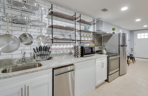 Modern Interior w/ Stainless Steel Appliances | WFH Desks | Electric Fireplace | 1,000 Sq Ft