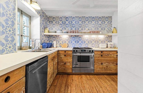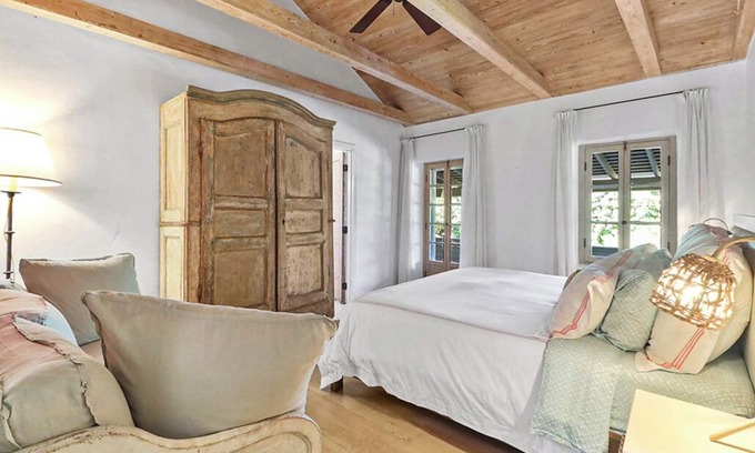 Situated on the edge of the historic village this former Catholic nunnery combines the charm of a historic house but with modern amenities to create a truly unique atmosphere. Decorated by internationally renowned designer Thomas Scheerer, The Convent’s interior is decorated in a pallet of soothing greys, whites and beige which allows the homes unique architecture and history to predominate. A covered veranda leads to the pecky Cyprus paneled foyer. The open living and dining room is to the right of the foyer and offers a plush linen slipcovered sofa and seating for 6 guests at the dining table. The kitchen is to the left of the dining room has all of the modern amenities one could want. There are three bedrooms situated on the second story.