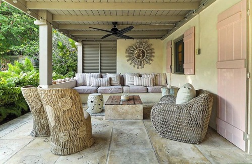 The veranda offers built-in L-shaped sofas at either end and is a sublime location to relax with a cool tropical libation or float in the swimming pool while enjoying the home’s large verdant garden.