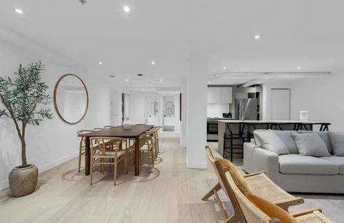 This four bedrooms, three full bathrooms and 1 powder room apartment is sleek, modern and bright with all the pleasant comforts of home, including en-suite laundry, black out curtains, a fully equipped kitchen so you can whip up something delicious with all those local products from the Marché, and a small dining area for four. As a bonus, there’s also a bathtub pour que tu relaxes bien dans le bain.