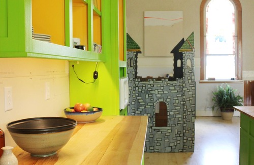 There is a light filled full bathroom with shower and large clawfoot bathtub, the kitchen is fully equipped, the dining table can seat 10 (additional tables and seating are available upon request), and in the comfortable sitting area there is a large screen television with dvd player, and stereo system. I have lived in this space with my young daughter, and I consider it to be very kid friendly; the cardboard castle is usually quite popular!