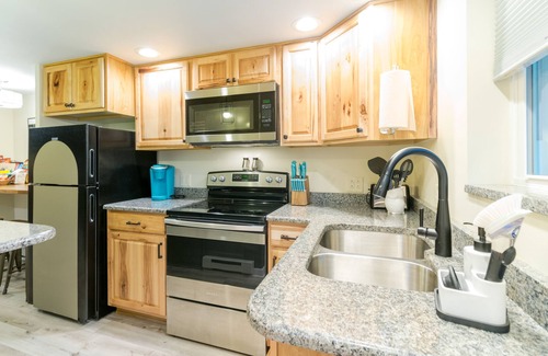 In the kitchen you will find a butcherblock breakfast bar, full-size refrigerator, oven, stove, microwave, Keurig coffee maker, toaster, blender, pots and pans, hickory cabinetry, and granite countertops…all which make preparing meals a breeze!