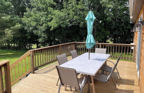 The Cottage's back deck has a gas grill and table with umbrella for outside dining. From there enjoy spectacular panoramic views of the southern Mohawk Valley hills and our lush landscape. Have fun on the large playing field, on the swings and at the basketball hoop, and fire pits shared by all guests at Double Play Cabins.