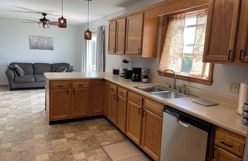 This modern house is a great choice for large families and members of a group to share. The Lodge - Unit A features wood and stone accents throughout 1,652 square feet of living space. The Master BR is large with a Queen size bed and has a TV and an ensuite bathroom. Bedroom 2 has a bunk bed with Queen on the bottom and XL Twin on the top. Bedroom 3 has a Queen size bed and TV. The kitchen is equipped with modern appliances including a dishwasher. There is also a Family Room area with TV next to the kitchen. A washing machine and dryer are in the laundry area / mudroom off the kitchen. The Lodge - Unit A has air conditioning and central heating.