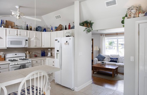 The sunny kitchen is well appointed for all your cooking needs. There's a gas range, side-by-side fridge with icemaker and dishwasher. Fully loaded with pots/pans, dishes and utensils, toaster, drip coffeemaker and blender.