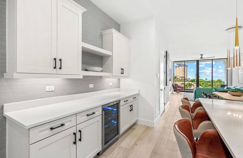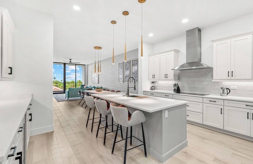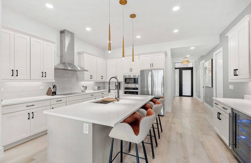 It's all about crisp, clean lines and a neutral palette in this pristine, modern chef's kitchen. Equipped with top-of-the-line stainless steel appliances, a generously sized island bar with seating, ample cabinetry, and all the essential cooking utensils, it's a culinary paradise ready to inspire your inner chef.