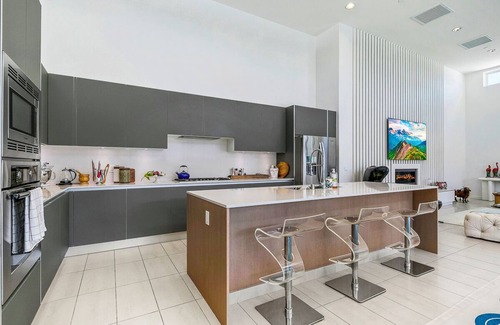 Strong home wide wi-fi Spectrum internet package at up to 600mbps. The living room has a 14.5' tall ceiling with clerestory windows, luxury sofa sectionals, a gas fireplace, and a 88” SmartTV. The living room also has wide open views of the open kitchen/dining/pool areas.