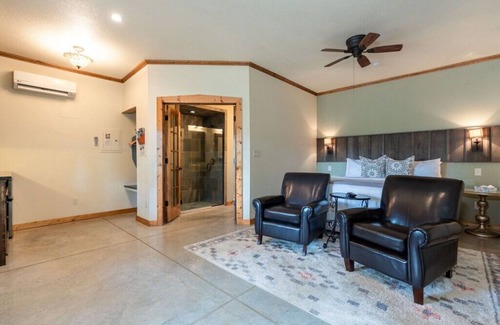 The Cork and Barrel suite was designed by a premier architect in the Hill Country and special attention was paid to the masonry and vaulted ceilings to create a unique, but beautiful setting for your stay. These aesthetics are paired with many modern amenities to pamper you and your significant other.