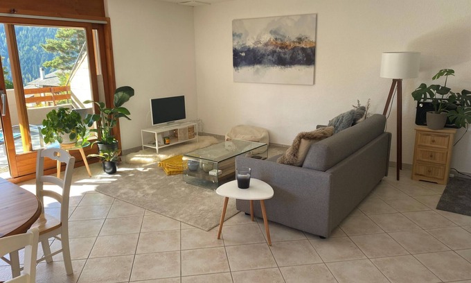 "Cormier 3", 3-room apartment 83 m2 on 1st floor, south facing position. Comfortable and beautiful furnishings: large living/dining room with 1 double sofabed (1 x 135 cm, length 250 cm), cable TV. Exit to the terrace. 1 room with 1 french bed (1 x 160 cm, length 200 cm). 1 room with 1 double sofabed (1 x 160 cm, length 180 cm). Large, open kitchen (oven, dishwasher, 4 ceramic glass hob hotplates, electric coffee machine, Capsules for coffee machine (Nespresso) extra, raclette grill, fondue Set (cheese)) with dining table. Bath/WC. South facing position, large terrace 29 m2. Terrace furniture. Panoramic view of the mountains. Facilities: iron, hair dryer. Internet (WiFi, free). Parking space n 3+ devant box N°3 (roofed, 2 cars).