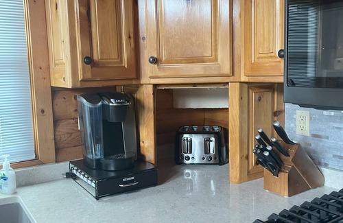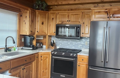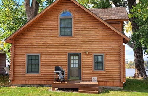 This beautiful 2 story log cabin is steps from the lake. Walk into the most charming and tastefully decorated lake place. This is a 2-bedroom, updated log cabin with a large stone fireplace. Open loft with King sized bed and stunning views of the lake from the oversized windows. 2 sleeper sofas are also available for use. It is a beautiful lake getaway! The bunk house offers a full queen bedroom, a small kitchenette, and an additional full bathroom. This is in an awesome location and just down the road from Hooligans Pub. Sandy Beach is excellent for swimming! Nice yard and layout! No pets allowed. This log home is equipped with a washer/dryer, crock pot, coffee maker, blender, toaster, and hairdryer. All linens provided!