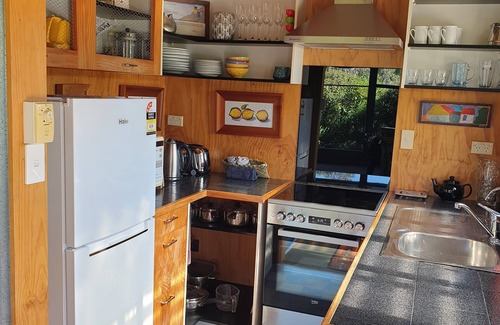 Welcoming and comfortable, Corru Gate Cottage has a zany kitchen, a sunny, open plan lounge/dining area, and French doors opening onto a deck and private garden - all with creative design. Check our other listings: Copper Gate is a new high-spec 4bdrm eco-home themed around heritage NZ domestic life and both feature local/NZ art. Tariff: $100/night extra for Copper Gate. 1 or 3 bdrm option for Copper Gate off-peak - see listing 23621. Or stay at Kissing Gate - luxury glamping with Settlers Cottage beside pond/glade - enquire directly with us at The Gates Accommodation/Canopy Camping Escapes