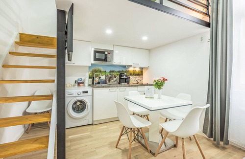2-room apartment 32 m2 on 2nd floor. Bright, fully renovated, very beautiful and modern furnishings: entrance hall. Living/dining room with 1 sofabed, 1 double bed, dining table and TV. Open small gallery with 2 sleeping facilities. Kitchenette (oven, 2 induction hot plates, toaster, kettle, microwave, freezer, electric coffee machine). Shower/WC. Facilities: washing machine, baby cot, hair dryer. Internet (WiFi, free). Please note: suitable for families apartment courtyard side. Non-smokers only. Maximum 1 pet/ dog allowed. Smoke alarm. Instead of an enclosed bedroom, some sleeping areas are located in an open-plan area (gallery, alcove, etc.).