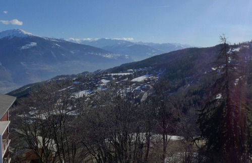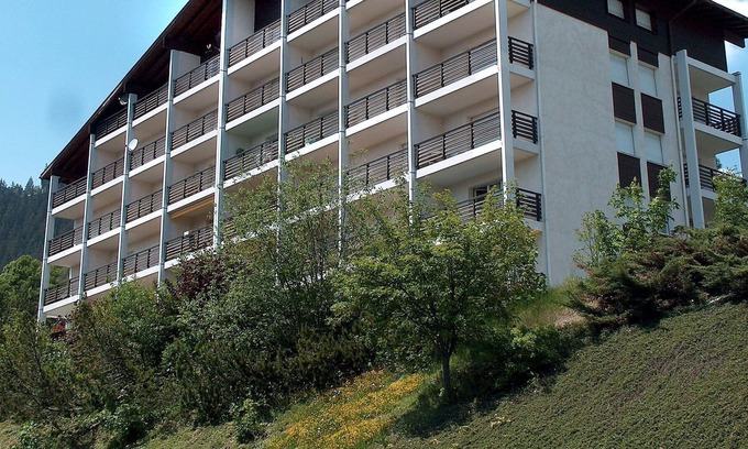 2-room apartment 60 m2 on 4th floor. Bright, beautiful furnishings: large living/dining room with 1 double sofabed (160 cm, length 200 cm), cable TV, flat screen, radio, CD-player and DVD. 1 room with 1 french bed (160 cm, length 200 cm). Open kitchen (3 hot plates, oven, dishwasher, toaster, kettle, electric coffee machine, raclette grill). Bathroom, bidet, sep. WC. Balcony 12 m2, south facing position. Terrace furniture. Very beautiful view of the mountains and the valley. Facilities: hair dryer. Internet (WiFi, free). Please note: non-smokers only. 1 pet/ dog allowed.