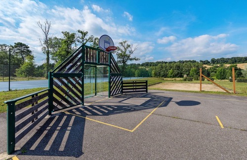 The resort features a sprawling 6-hectare property adorned with lush plants, trees, and a picturesque meadow. Two fenced swimming pools are available for seasonal use from May 15th to September 15th, complete with shower and toilet facilities in the pool area. Additionally, guests can enjoy a variety of outdoor activities such as tennis, boccia, and beach volleyball.