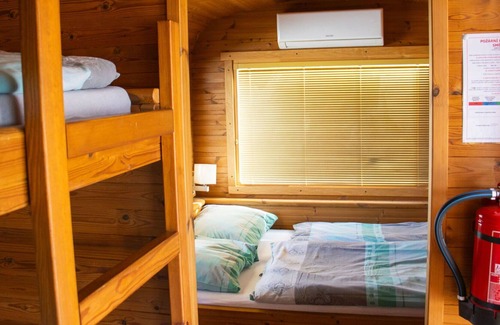 2-room mobile home. 1 room with 1 double bed and satellite TV. Kitchen-/living room (2 ceramic glass hob hotplates, kettle, microwave) with 1 x 2 bunk beds. Shower/WC. Heating, air-conditioning. Terrace furniture. Facilities: Internet (WiFi, free). 2 pets/ dogs allowed.