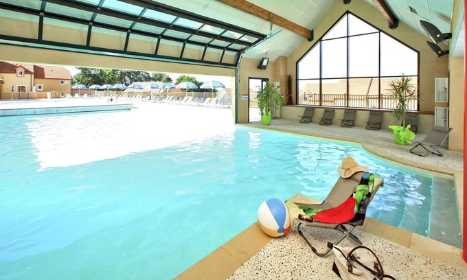 Child friendly resort "Les Coteaux de Sarlat". 100 houses in the residence. 2.5 km from the centre of Sarlat-la-Caneda, on the outskirts, 50 km from the centre of Brive, on a slope. For shared use: property 30'000 m2 (fenced) with lawn and trees, swimming pool heated (17 x 7 m, depth 100 - 140 cm, seasonal availability: 11.Apr. - 24.Oct.). Children's pool, table tennis, basketball, boccia, children's playground. In the complex: reception, sauna (extra). Fitness room, steam room (extra). Washing machine, tumble dryer (for shared use, extra). Bread roll service. Parking on the premises. Shop 1.7 km. Minigolf 100 m. Please note: Loading and unloading of baggage is possible at the holiday house. The photograph shows a typical example. The holiday properties may differ in living space, floorplan, equipment and furnishing.