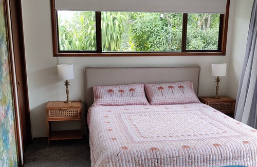 Cosy cottage with a fun interior situated on a working avocado orchard and surrounded by gorgeously lush gardens. Extremely private and calm, it has a large outdoor deck and BBQ. Just 7 mins from beach!