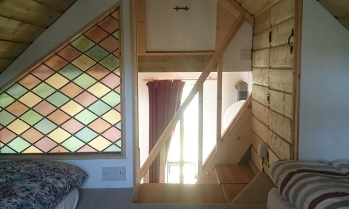 Separate from the cottage is the chalet/barn. An open plan conversion which has its own double height living space with wood stove, kitchenette and staircase leading to a cosy bed platform that sleeps two. Ideal for group or family members who want a bit of their own space while living separately from the main house.