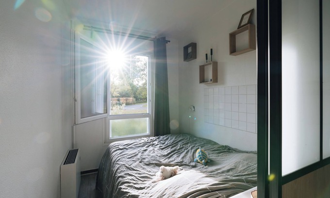 Rest and rejuvenate in this tranquil and well-lit bedroom, where a comfortable double bed invites you to unwind. Natural light streams in through the glass window, offering outdoor views that add enchantment to your stay. The apartment is in the ground floor and offer a view on the shared outdoor space. It is used by all the neighbours and makes it a vibrant space during the day!