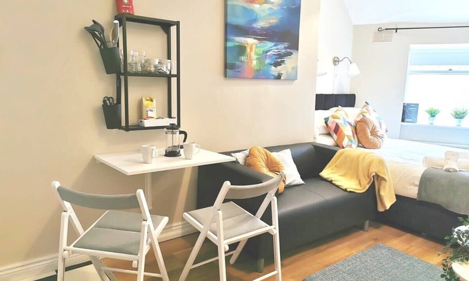 This small but fully fitted out studio apartment has a perfect location in Dublin City, with a host of shops, restaurants, cafés and bars closeby. The city can be explored on foot and there are rail, bus & tram links also. This newly refurbished apartment has fully equipped kitchen, TV and reliable wifi and a desk/dining table that would suit anyone looking for a home from home in Dublin city centre. While small this studio is well equipped for long/short stays.