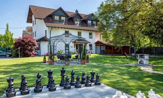The cosy vacation apartment 7 on the Trostelhof in Salem-Neufrach is a place with history, embedded in vineyards and orchards and not far from Lake Constance. Up to 4 guests can be accommodated in the 52 m² souterrain apartment with its bedroom with a double bed and living room with a sofa bed for 2 people. It includes a living room with a comfortable dining area and a daylight bathroom with shower. The well-equipped kitchen scores with a dishwasher, kettle, toaster and coffee machine. Additional amenities include Wi-Fi, satellite TV, DVD and CD player. A baby cot and a highchair are available free of charge on request. The large south-facing balcony with its comfortable garden furniture and parasol invites you to enjoy a hearty breakfast in the morning. In the spacious garden, which you share with your hosts, you can enjoy carefree hours on the sunbathing lawn or at the barbecue while the children have fun on the large playground, playing table tennis or soccer. The guesthouse "Trostelhof" is situated in a quiet but central location in the center of Neufrach. Two bakeries, a butcher's shop and a supermarket can be reached within 5 to 10 minutes on foot (350 m to 1 km). Furthermore, there are several restaurants in the village, which spoil their guests with culinary delicacies from the region but also from all over the world. Salem is a state-approved resort. Besides the famous castle, Salem offers numerous other sights, including Europe's largest fire department museum, the 1000 m² wine cellar of the Margrave of Baden and the castle lake with its own bathing area. Lake Constance with its numerous excursion possibilities such as the flower island Mainau, the historical old town of Meersburg or the pile dwellings in Unteruhldingen is only 15 minutes by car (10 km).