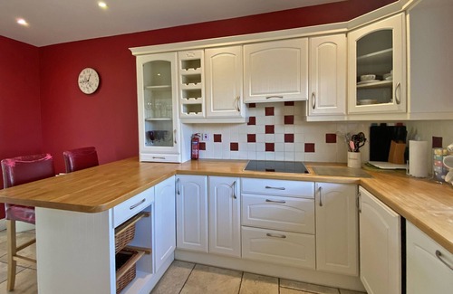 Ground Floor Accommodation: The ground floor accommodation consists of an open plan kitchen, dining and living room. The living room area is well presented with timber floors, comfortable suite, TV & DVD player, and wood burning stove. The large kitchen and dining room is very well equipped with all necessary equipment and modern conveniences including a dishwasher, fridge freezer, microwave, electric hob, and double oven. Double doors open out on to the garden area, which includes garden furniture. A guest bathroom with WC and hand basin and a separate utility room which houses a washing machine and dryer are also on the ground floor.