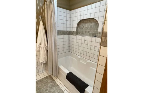 Full bathroom with tub/shower combo and heated floors. We provide eco- and body-friendly hand soap, shampoo and body wash. Cotton robes and bath salts provided.