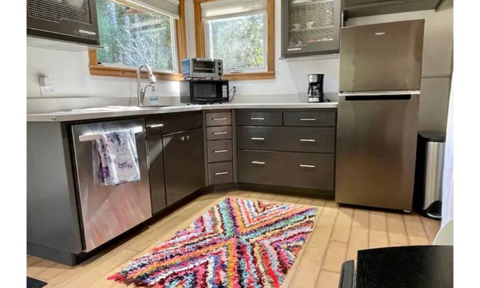 Kitchenette has refrigerator, microwave, toaster oven, hot plate, sink and dishwasher. It is stocked with tools to prepare simple meals (think fried eggs and toast, spaghetti with sauce from a jar, reheated leftovers, etc). There is no stove or oven. Coffee maker, electric kettle, coffee and tea are included. Eggs from our flock are available spring through fall. We are eco-conscious and provide fabric dish towels, dish rags and Swedish dishcloths in lieu of single use paper towels. Our water is UV-purified spring water. Yes, you can drink it!