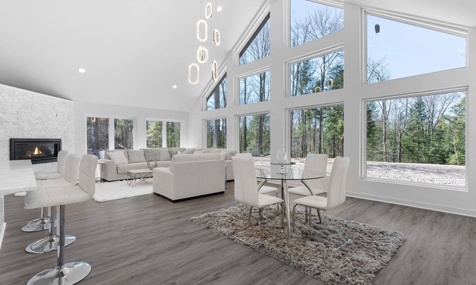 2 newly built cottages. The main cottage Is ultra luxurious with huge master bedroom with ensuite Roman soaker tub, shower gas fireplace sitting area walk in closet completely open concept 17 foot cielings windows everywhere full kitchen with center island secondary full bathroom and gas fireplace in main living area. Fully heated and air-conditioned