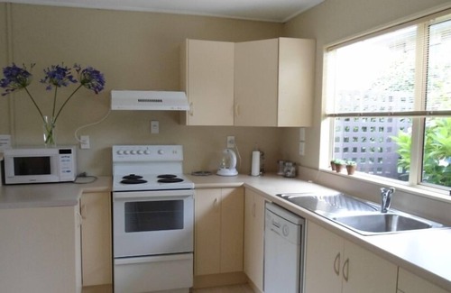 The compact sunny bedroom has a comfortable Queen size bed with lambs wool underlay, fresh cotton sheets with goose down duvet plus electric blanket and spare blankets. Double wardrobe and drawers.