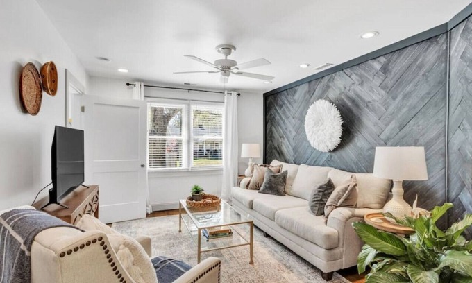 Upon arrival, guests may park in the spacious driveway. Our front door is equipped with a smart lock for convenient and simple entry. Inside the cottage, you will be greeted with gorgeous decor and all you need to have a comfortable and convenient stay. Our kitchen has all appliances and is fully stocked with all you need to cook and bake. Our coffee station includes a Keurig as well! Off the kitchen is our chic living room, which includes a smart tv (Roku), sofa, and accent chairs for you to kick back and relax.