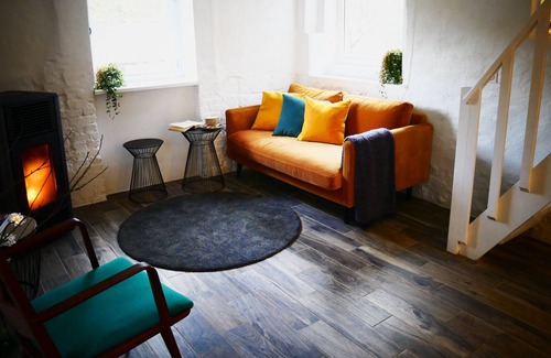 - a sitting area with windows overlooking the garden and equipped with a pellet stove