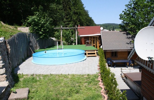 storey wooden cottage with partly EMBEDDED SWIMMING POOL with "beach", WIFI, SAUNA and outside SUMMER KITCHEN located at the end of the village in villa´s area under the forest, 2 km from Janské Lázně, 12 km from Pec pod Sněžkou and 10 km from Trutnov.