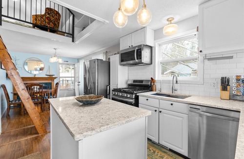 The cottage features a full kitchen and dining area, living room, 1 bedroom with queen size bed, 2 full beds in loft area, 1 full bathroom. Extra sleeping on sofa bed in the living room is available as well as an extra inflatable twin mattress.