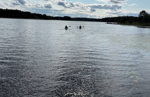 This cozy four season cottage sits on 4 acres with mature trees and a short path down to 79 feet of lake frontage on Little Long Lake. Next to ATV/ Snowmobile Trails. There are 3 kayaks, 1 paddle boat, 1 paddle board, jon boat, swim mat, yoga mats and so muxh more. There are 2 fire pits with chairs on the property. The cottage has 2 bedrooms which are located in the second level. The first bedroom has a queen sized bed and a twin bed with a large dresser snd closet. The second bedroom has a double bed, a twin trundle under doubke bed with a dresser and closet. The bathroom is located on the maon level. The washer and dryer is located near the stairwell. There is a sofa sleeper in thr living room along with a shelf full of board games, puzzles and books. The kitchen is dully equipped with a coffee/ tea station and a large 6 person dining room table. There are 5 sets of snowshoes and poles available for guests.