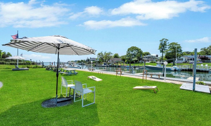 The Drake Inn is a laid-back retreat in Hampton Bays, a hamlet on the Town of Southampton's west side, located two miles from some of the Hamptons' most beautiful Dune Road beaches. Situated on a canal off Shinnecock Bay, the property features a pool and large waterfront lawn with seating and games to keep everyone happy.