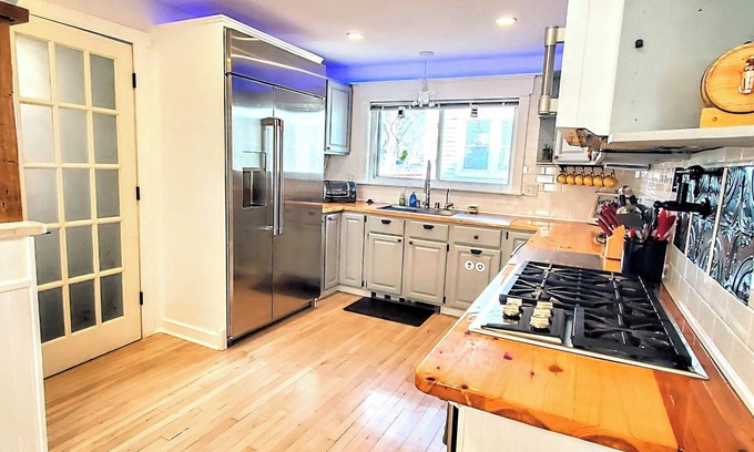 Freshly renovated full first floor and partial basement of my 1930's 1.5-story Cape Cod residence. Clean Scandinavian/Farmhouse interior vibes. Front door, and back door entrances. Open and well-equipped kitchen with laundry area in basement. Sunny, enclosed front porch with hanging swing and bench. 10x12' deck in the rear with umbrella table and chairs. For groups wanting more privacy from those they travel with, the rear portion of the unit also functions as a separate Suite. Both sides can be partitioned off with duel locking doors (much like adjoining rooms in a hotel).